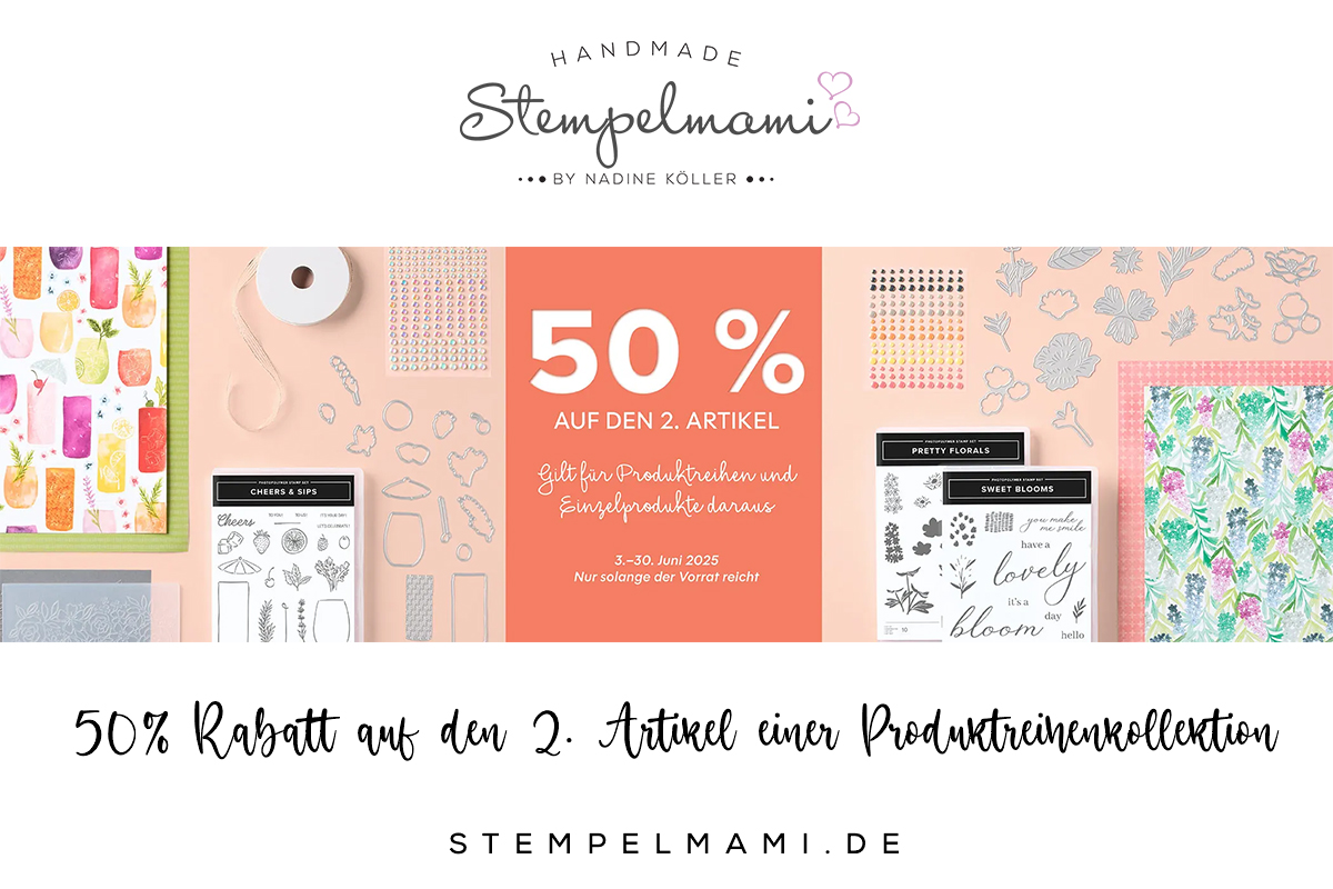 Hallo Ihr Lieben, wie im vorherigen Beitrag bereits geschrieben, erwartet Euch im Juni noch eine tolle Aktion von Stampin‘ Up!. Denn beim Kauf von 2 Artikeln einer Produktreihen Kollektion gibt es 50% Rabatt auf den 2. Artikel einer Produktreihen Kollektion.