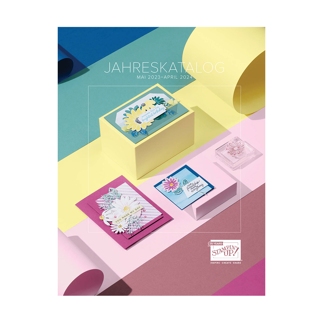 Der Jahreskatalog beinhaltet das komplette Hauptsortiment. Dazu gehören Stempelsets, Arbeitsmittel, Papier, Accessoires