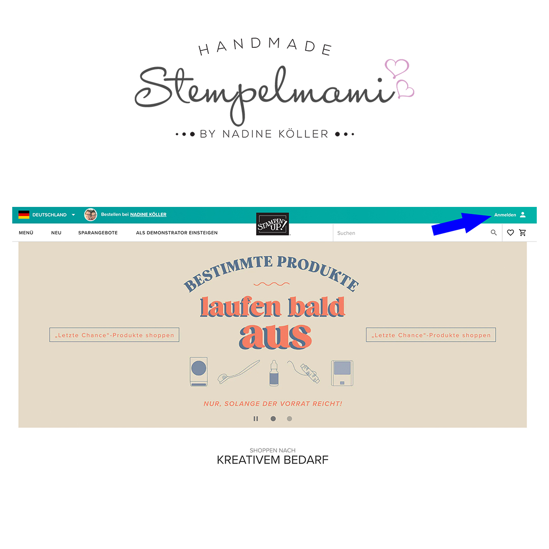 - Gehe dazu wieder auf die Seite vom Stampin‘ Up! Online Shop und klicke oben rechts auf „anmelden“. Im neu geöffneten Fenster kannst Du Dich dann in Deinem Kundenkonto einloggen bzw. anmelden (siehe hierzu auch noch einmal Bild 1 und Bild 2).