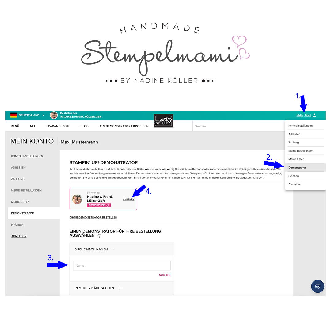 - Solltest Du hier noch keinen Demonstrator oder Demonstratorin ausgewählt haben, so gebe in das Suchfeld (siehe 3. blauer Pfeil) einen gewünschten Namen ein oder verwende das Suchfeld „In meiner Nähe suchen“. Wähle hier dann Deinen gewünschten Demonstrator oder Demonstratorin aus.